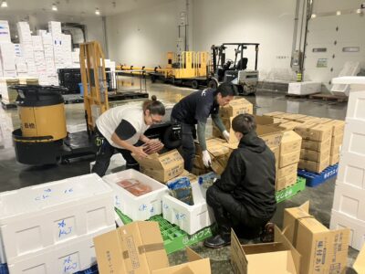 午前4時 冷凍品の梱包が終了したらさあ、今度は生鮮品の振分け、梱包です
